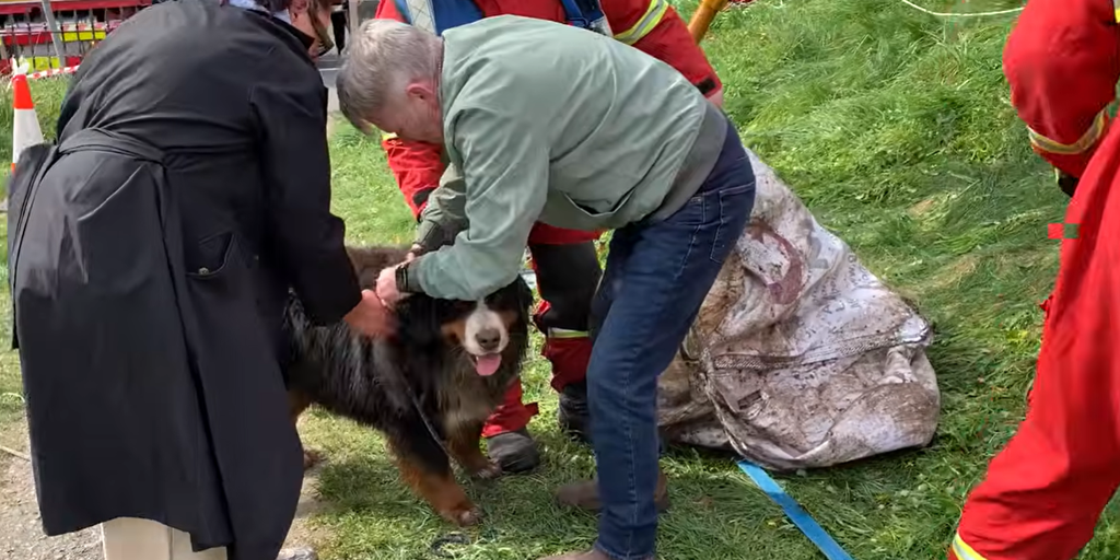 BIRR, Ireland — A Bernese Mountain dog was reunited with its owners Sunday after plunging nearly 40 feet down a hole believed to be an old well.